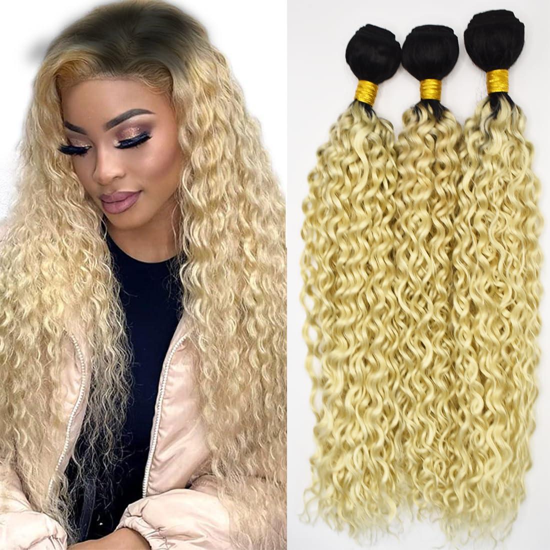 - Human Hair Bundle MaterialBrazilian Virgin Human HairCurly Wave 3 BundleT1B/613 Black to Blonde Color.