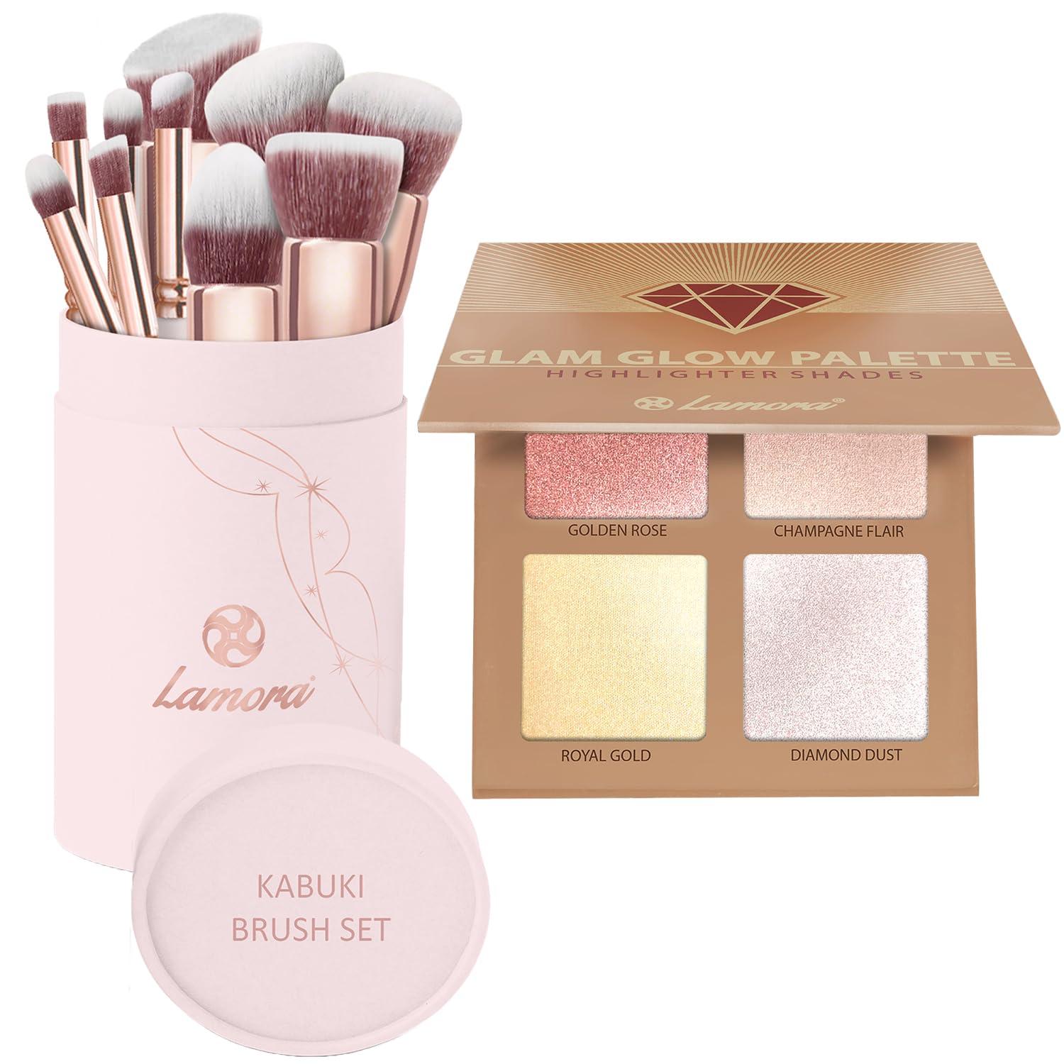 Highly pigmented powder highlighter palette with foundation makeup brush set.