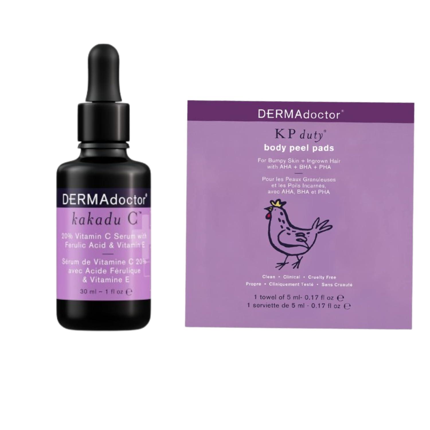Transform your skincare routine with the Kakadu C 20% Vitamin C Face Serum and DERMAdoctor KP Duty Body Peel Pads bundle, designed to deliver radiant, smooth skin from head to toe. Harness the power of Kakadu Plum, one of the richest natural sources of Vitamin C, to brighten your complexion and improve the appearance of fine lines and wrinkles. This lightweight serum is enhanced with Ferulic Acid and Vitamin E, providing potent antioxidant protection against environmental aggressors. Complement your facial care with the easy-to-use body peel pads featuring glycolic, lactic, and salicylic acids. These powerful AHAs and BHAs work together to exfoliate rough, bumpy skin, effectively treating keratosis pilaris, ingrown hairs, and uneven skin tone. Both products are dermatologist-tested, hypoallergenic, and cruelty-free, ensuring safe and effective care for your skin. Experience the DERMAdoctor difference and reveal your best skin today!