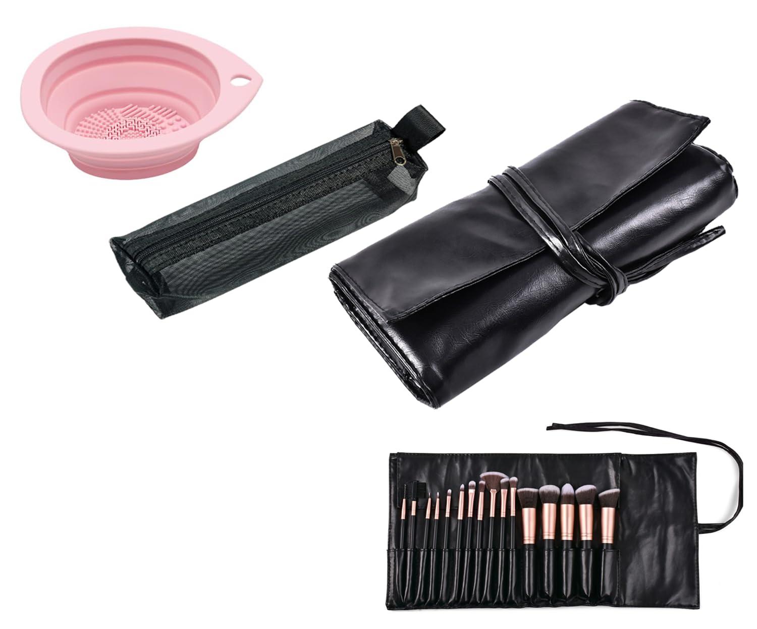 - Our Set included: 1*Makeup Brush Rollup Bag & 1*Foldable Makeup Brush Cleaner Bowl* 1 Mesh Cosmetic Bag. Makeup Brush Organizer size is 17.13*8.67inch, Silicone Makeup Brush Cleaning Bowl size is 4.33*3.46*1.57 inch, Travel Mesh Cosmetic Bag size is 7.87*2.36 inch. Please noted the Brushes in the pictures will NOT be included in this set.