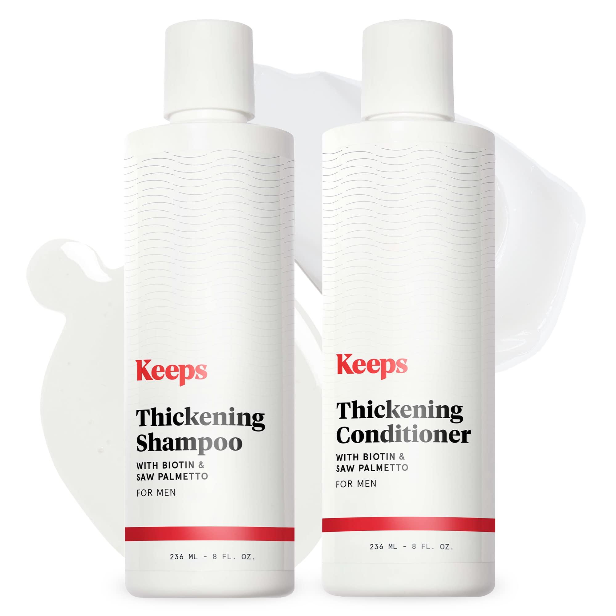 - Thickening Shampoo & Conditioner Bundle for Men: Better hair is just a rinse away with Keeps Thickening Shampoo and Conditioner. Our shampoo and conditioner bundle is formulated to make thinning hair look thicker while promoting healthy hair growth. It also works great to complement and enhance results of male hair loss treatment. Includes one 8oz bottle of Keeps Thickening Shampoo and one 8oz bottle of Keeps Thickening Conditioner.