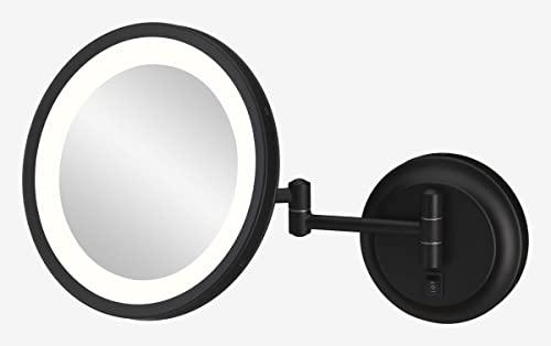 Simple and classic Those are the words to describe this singlesided, round, magnified makeup mirror. The large 9.5 diameter lens is surrounded by light that can switch from warm white to cool white light. The 5x magnified lens gives you all you need for detailed grooming and the 12.8 extension on the double arms allows you to place the mirror exactly where you want to see yourself. Features. Backed by the best customer service team in the industry. SingleSided LED Round Arm Wall Mirror HardwiredSpecifications. Color Matte Black. Shape Round. Diameter 9.5. Extension 12.8. Weight 5 lbs