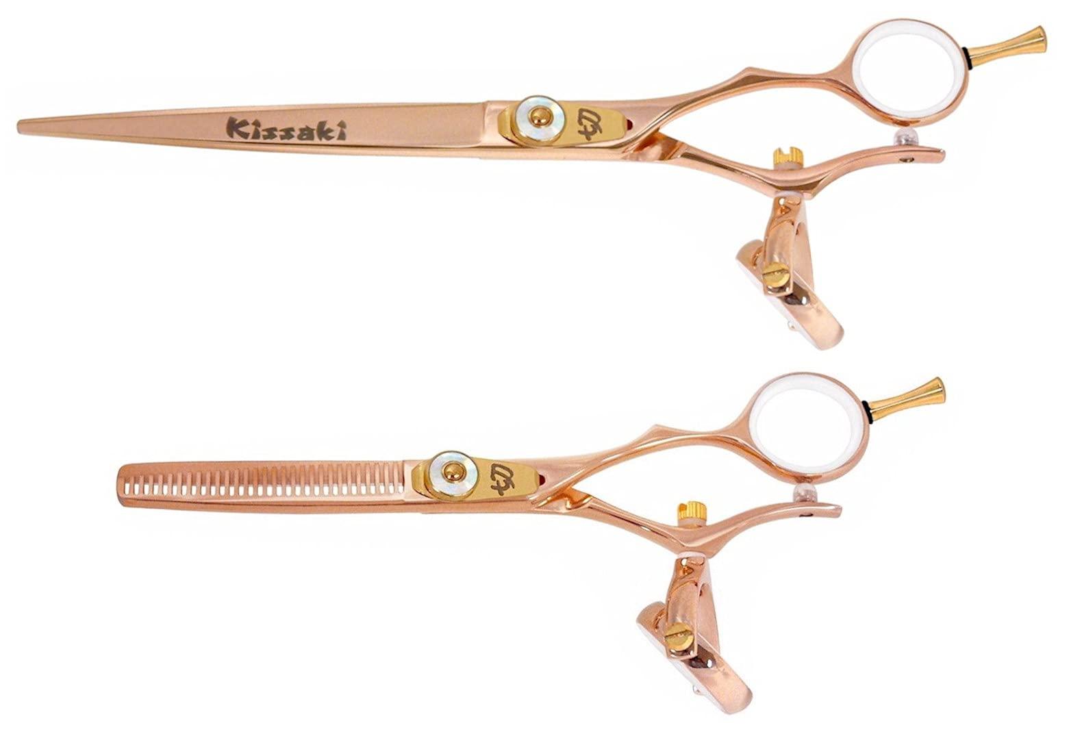 Gokatana 7.0" Double Swivel Hair Cutting Shears Rose Gold W Titanium & Kanagawa 5.5" 30 tooth Double Swivel Hair Thinning Shears Rose Gold W Titanium with white easy click leaf spring tension adjustment knob in a matching set. The thumb swivels full range of 360 degree motion, great for reducing and preventing Carpal Tunnel Syndrome and painful cutters cramp. Featuring the Kissaki ultra sharp Convex edge, triple hand honed and hollow ground for durability and Razor sharpness. These Double Swivel Hairdressing Scissors are made from the Highest Quality Japanese Hitachi SUS 440C Stainless Steel (Rockwell Hardness of 60+) and coated with beautiful Rose Gold Titanium for extended durability. All Kissaki Hair Shears come with our beautiful custom shear case including lubricant, finger sizing rings and a leather cleaning - polishing cloth and have a Lifetime Warranty against defects in parts, materials & workmanship.