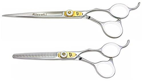 Horimono 7.5 Hair Cutting Shears & Tobiyaki 6.0 30 tooth Thinning Shears featuring an offset grip and easy click leaf spring tension adjustment knob. These Hair Scissors are made from the Highest Quality Japanese Hitachi SUS 440C Stainless Steel (Rockwell Hardness of 60+) and polished to a brilliant Mirror Finish. All Kissaki Hair Shears come with our beautiful custom shear case including lubricant, finger sizing rings and a leather cleaning - polishing cloth and have a Lifetime Warranty against defects in parts, materials & workmanship.