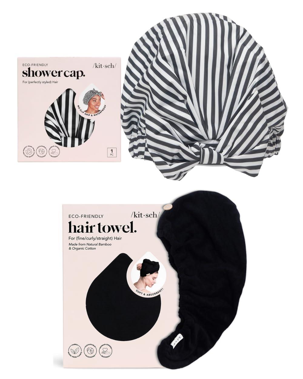 A bundle of Kitsch Luxury Shower Cap (Stripes) and Kitsch Microfiber Hair Towel (Black)