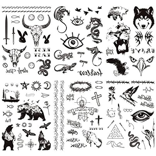 Have all the fun without the commitment. These tattoos will last from 2-5 days depending on where they are placed and how well you take care of them.\nAvoid soap, sunscreen and oils to prolong the life of your tattoos.\nYour Friends will say, \"Were did you get those!\"\n\nHow To Use:\n1. Cut out tattoo of choice and remove the transparent film.\n2. Place tattoo face down on skin.\n3. Wet the tattoo thoroughly with a sponge or towel.\n4. After 20-30 seconds, gently remove the back paper.\n5. Allow tattoo to dry.\n\nTo Remove:\n1.Dab tattoo with rubbing alcohol or baby oil.\n2.Wait for 10 seconds,then rub gently and repeatedly again until removed.\n\nNote:\n1. Not intended for children under 6 years.\n2. Due to the difference between different monitors, the picture may not reflect the actual color of the item. Thank you!\n\nColor: Black\nWeight: About 10g/0.32oz per sheet\nDimension:About 5.8\'\' * 8.2\'\'\n\nPackage Included:\n6 x Sheet Stickers\n1 x Instructions\n\nShipping:Please make sure your shipping address is current and correct when you order, Apt # and ZIP CODE matters also.