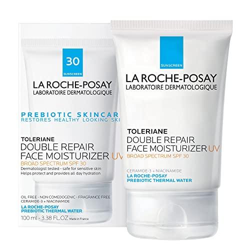- Toleriane Double Repair Face Moisturizer UV is formulated with a high concentration of La Roche-Posay prebiotic thermal water, ceramide-3, niacinamide, and glycerin, providing up to 48hr hydration and restoring skin's natural protective barrier