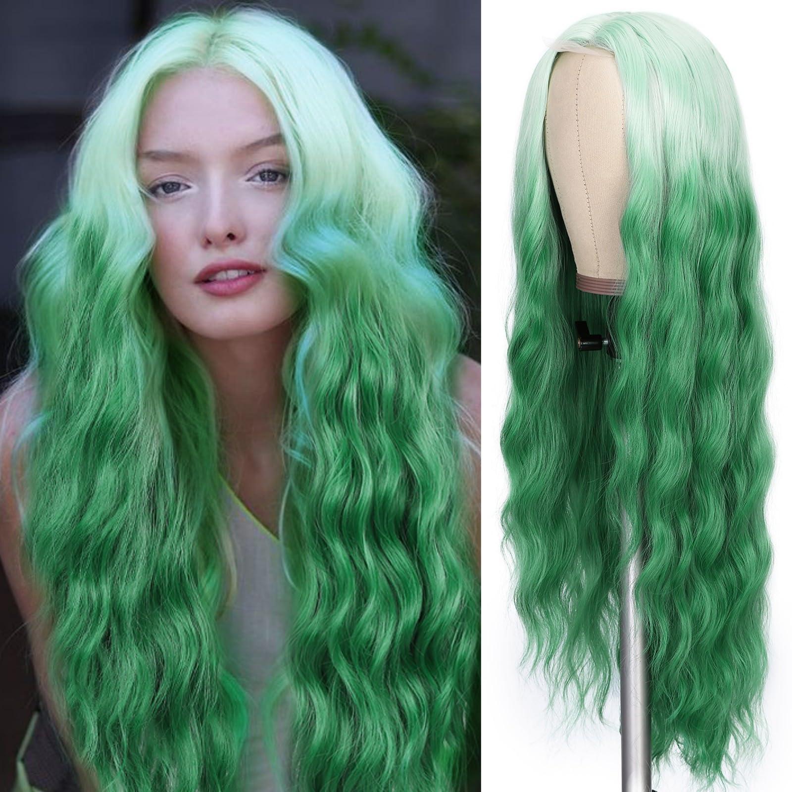 - Feature & StyleThe green wigs for women has a small area hand-knitting lace scalp part, the new technology natural hairline is more realistic. The long wavy wig is suitable for any face shape. A natural and stylish looking will help you change your style and make you confident and charming.
