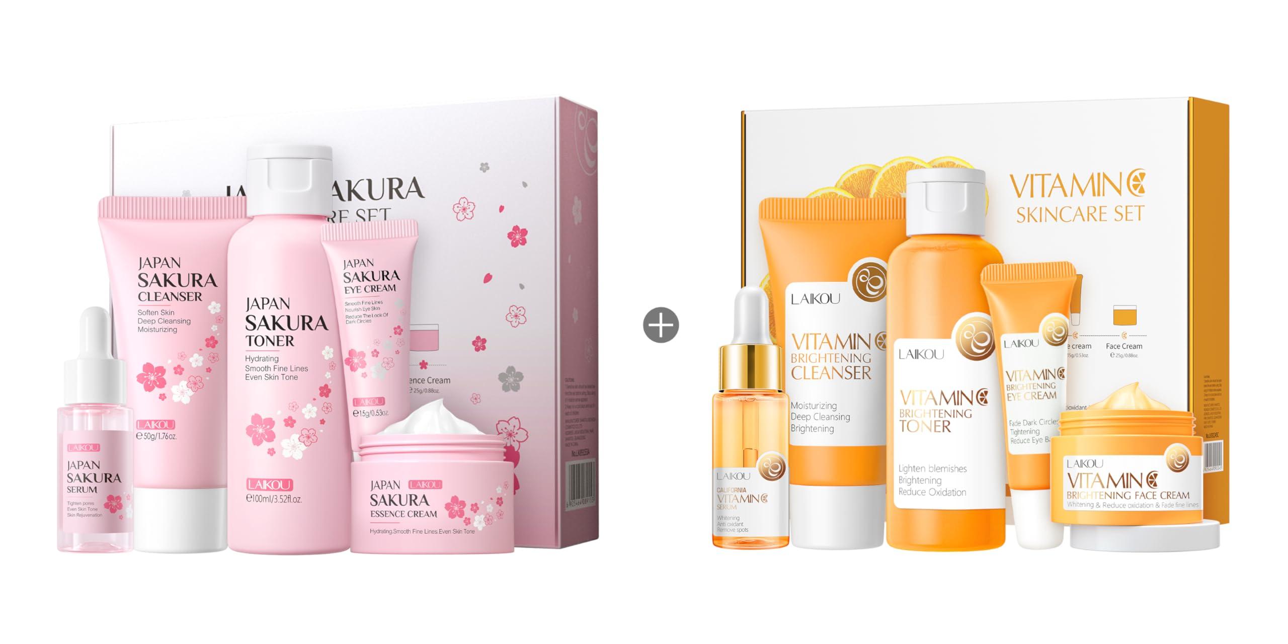 LAIKOU Skin Care Power Duo Box, LAIKOU Japan Sakura Skin Care Kit + LAIKOU Vitamin C Skin Care Kit, Daily Skin Care Routine, Travel Kit