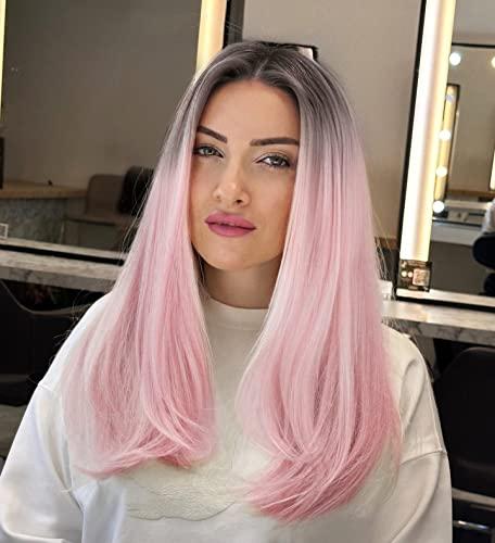 ? Lanova Baby Pink Wigs with Dark Roots Middle Part Natural Straight Synthetic Wigs Pink 20 inch