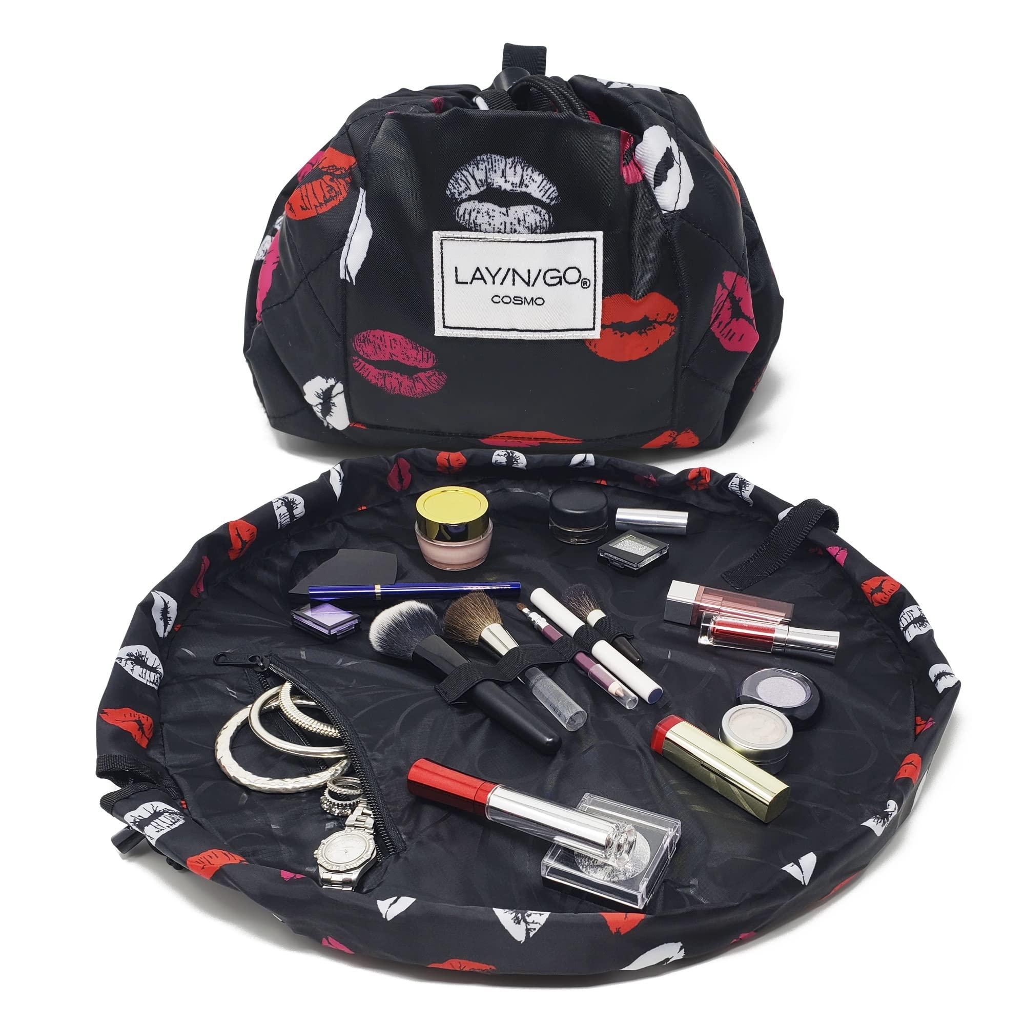 - QUICK & EASY CLEANUP: No more digging through messy makeup bags. Our lay-flat makeup organizer bag lets you see all your cosmetics at once. The raised lip keeps items in place, and with a simple pull of the drawstring, you're packed and ready to go.