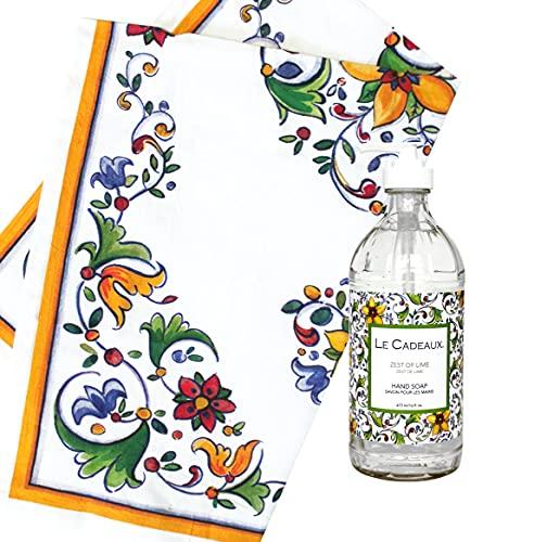 This Le Cadeaux gift set includes liquid hand wash in a decorative glass bottle with matching cotton tea towel. This set makes a beautiful gift and will enhance any bathroom or kitchen decor. The hand soap is infused with essential oils and is paraben, phosphate, ammonia and chlorine free. The tea towel is made of 100% cotton flour sack and is machine washable. Product includes 1 x liquid hand wash in glass bottle with dimensions 2.5 wide by 8 tall and 1 - 18" x 29" tea towel.