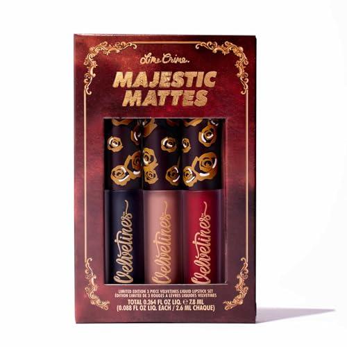 - Majestic Mattes Lip Trio: Lime Crime's Limited Edition Majestic Mattes Lip Trio features one best-selling Velvetines Liquid Lipstick shade and two new shades! Set contains Feelins (deepest true red), Forbidden (medium neutral nude), and Rebellion (black with silver shimmer). Velvetines Liquid Lipsticks easily glide on your lips and dry down to a soft matte finish with a creamy velvety texture like a rose petal.