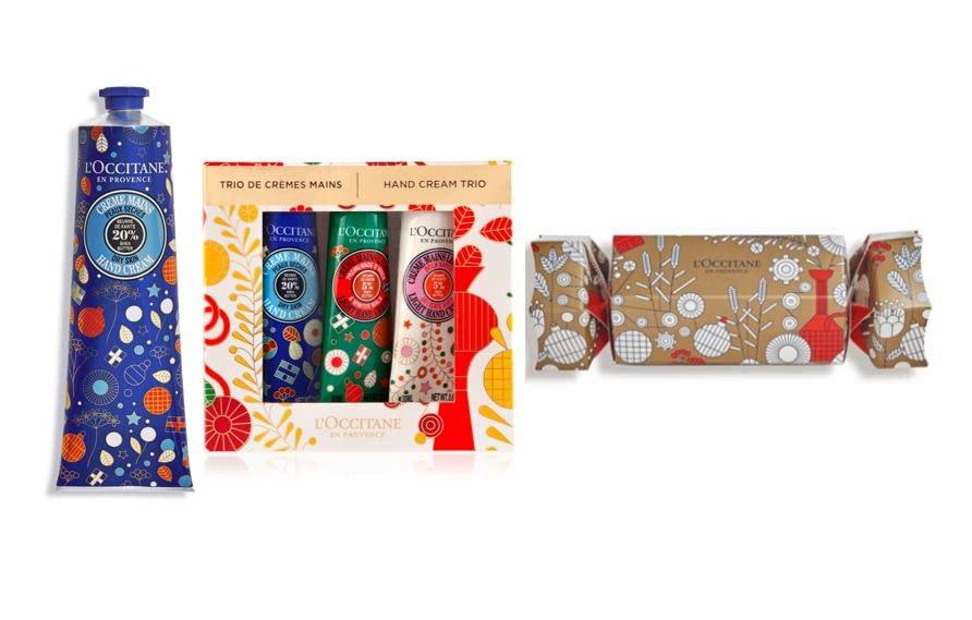 Our Limited-Edition Packaging denotes three scents in this holiday set. The classic blue Hand Cream Shea, which is our 20% Shea Butter hand cream; the Green Shea Winter Walk Hand Cream, with juicy fig notes highlighted by sparkling mandarin accents; and the Pink Delicate Shea Hand Cream, with soft floral notes and a splash of vanilla. Get these three hand creams in three different holiday packaging!