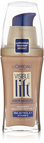 Introducing a breakthrough in age perfecting makeup. Only L'Oral Paris Visible Lift Serum Absolute Foundation features a serum of 5 ingredients in 1 radiant foundation makeup. Visible Lift Serum Absolute Foundation instantly evens skin tone with a luxuriously lightweight liquid formula that doesn't settle into lines and wrinkles. In four weeks, see skin visibly transform to smoother, brighter, even, and flawless. Visible Lift Serum Absolute is a medium coverage foundation infused with SPF 17. Real women saw visible results: 87% saw more even skin tone. *87% saw minimized imperfections. *79% saw more radiant skin. *68% saw appearance of wrinkles reduced.* Smoother, brighter, flawless skin Instantly hydrates and evens tone Foundation infused with Pro Retinol A and Vitamin C Foundation with SPF 17 Results based on consumer responses in a 4-week clinical study with makeup on, after 4 weeks of use. **Results based on consumer responses in a clinical study with makeup on, immediately after application. Dispense foundation onto sponge or fingertips as needed and rub onto face. Wash hands immediately after use. For external use only. Avoid contact with eyes. Discontinue use if signs of irritation or rash appear. Keep out of reach of children.