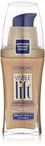 Introducing a breakthrough in age perfecting makeup. Only L'Oral Paris Visible Lift Serum Absolute Foundation features a serum of 5 ingredients in 1 radiant foundation makeup. Visible Lift Serum Absolute Foundation instantly evens skin tone with a luxuriously lightweight liquid formula that doesn't settle into lines and wrinkles. In four weeks, see skin visibly transform to smoother, brighter, even, and flawless. Visible Lift Serum Absolute is a medium coverage foundation infused with SPF 17. Real women saw visible results: 87% saw more even skin tone. *87% saw minimized imperfections. *79% saw more radiant skin. *68% saw appearance of wrinkles reduced.* Smoother, brighter, flawless skin Instantly hydrates and evens tone Foundation infused with Pro Retinol A and Vitamin C Foundation with SPF 17 Results based on consumer responses in a 4-week clinical study with makeup on, after 4 weeks of use. **Results based on consumer responses in a clinical study with makeup on, immediately after application. Dispense foundation onto sponge or fingertips as needed and rub onto face. Wash hands immediately after use. For external use only. Avoid contact with eyes. Discontinue use if signs of irritation or rash appear. Keep out of reach of children.