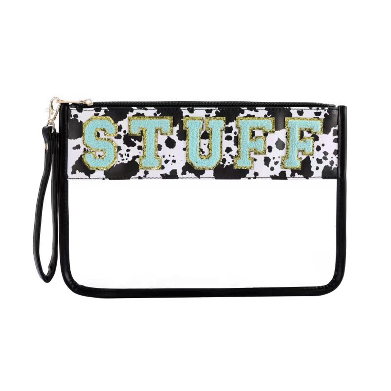 - [Glitter Chenille Letters] This clear makeup letter bag has professionally stiched chenille letter patches which with fun glittered edge that makes it stand out from all your other cosmetic bags.