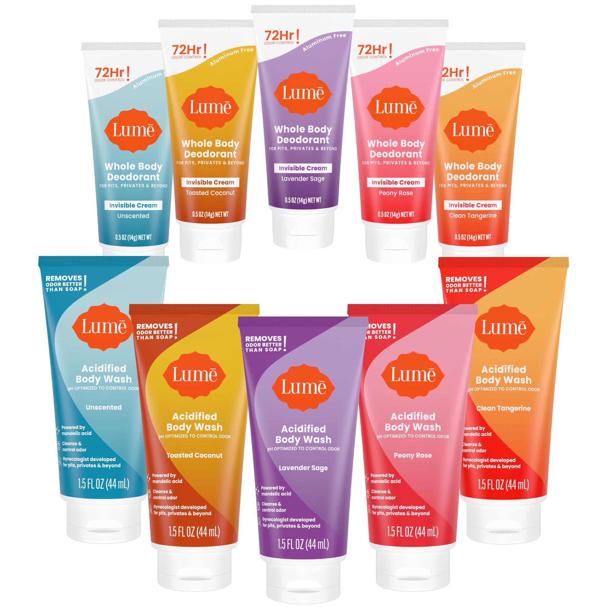 pH OPTIMIZED - Traditional soap gets you clean, but it raises the pH of your skinhelping odor bloom more quickly. Our acidified cleansing formula supports skin that smells better longer. KNOCK OUT AND CONTROL ODOR - Lume Acidified Body Wash is clinically proven to remove odor better than traditional soap and control odor for 24 hours after you step out of the shower. VISUALLY EVENS SKIN TONE - Clinically proven to reduce the appearance of hyperpigmentation and visually even skin tone. SKIN LOVING - Formulated without SLS, SLES, phthalates, and parabens to safely cleanse ALL your odor prone areas. For outrageously effective odor control, follow with any Lume Whole Body Deodorant. BOXED SET INCLUDES 5 SCENTS - Clean Tangerine, Lavender Sage, Peony Rose, Toasted Coconut, and Unscented. Perfect for gift gifting, travel, or trying new scents. SMELL BETTER EVERYWHERE - Odor control for pits, privates and beyondthink feet, underboob, belly buttons, tummy folds, butt cracks, thigh creases or anywhere else you have odor but wish you didnt. OUTRAGEOUSLY EFFECTIVE - Lume is clinically proven to block body odor all day and continues to control odor for 72 hours. POWERED BY SCIENCE - Rather than covering up odor after it forms, our formula is pH optimized to block odor before it starts. You could even call us a PREodorant! SERIOUSLY SAFE - Doctor developed for women and safe for any external use. Aluminum free, baking soda free, and paraben free. Hypoallergenic and skin safe for even our most sensitive parts.