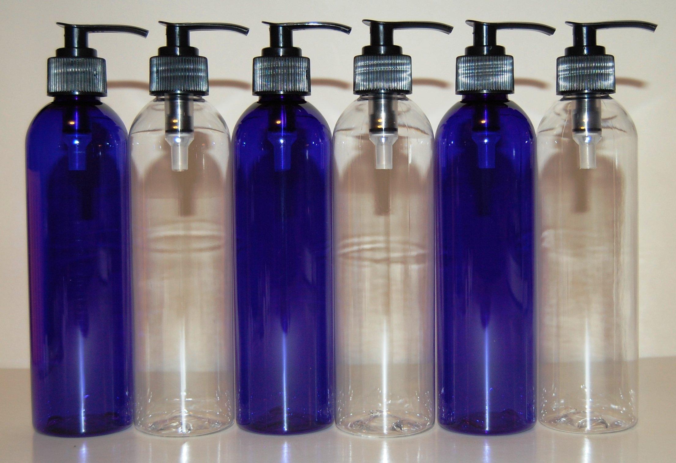 - A package of three clear and three blue plastic bottles and six black twist pumps