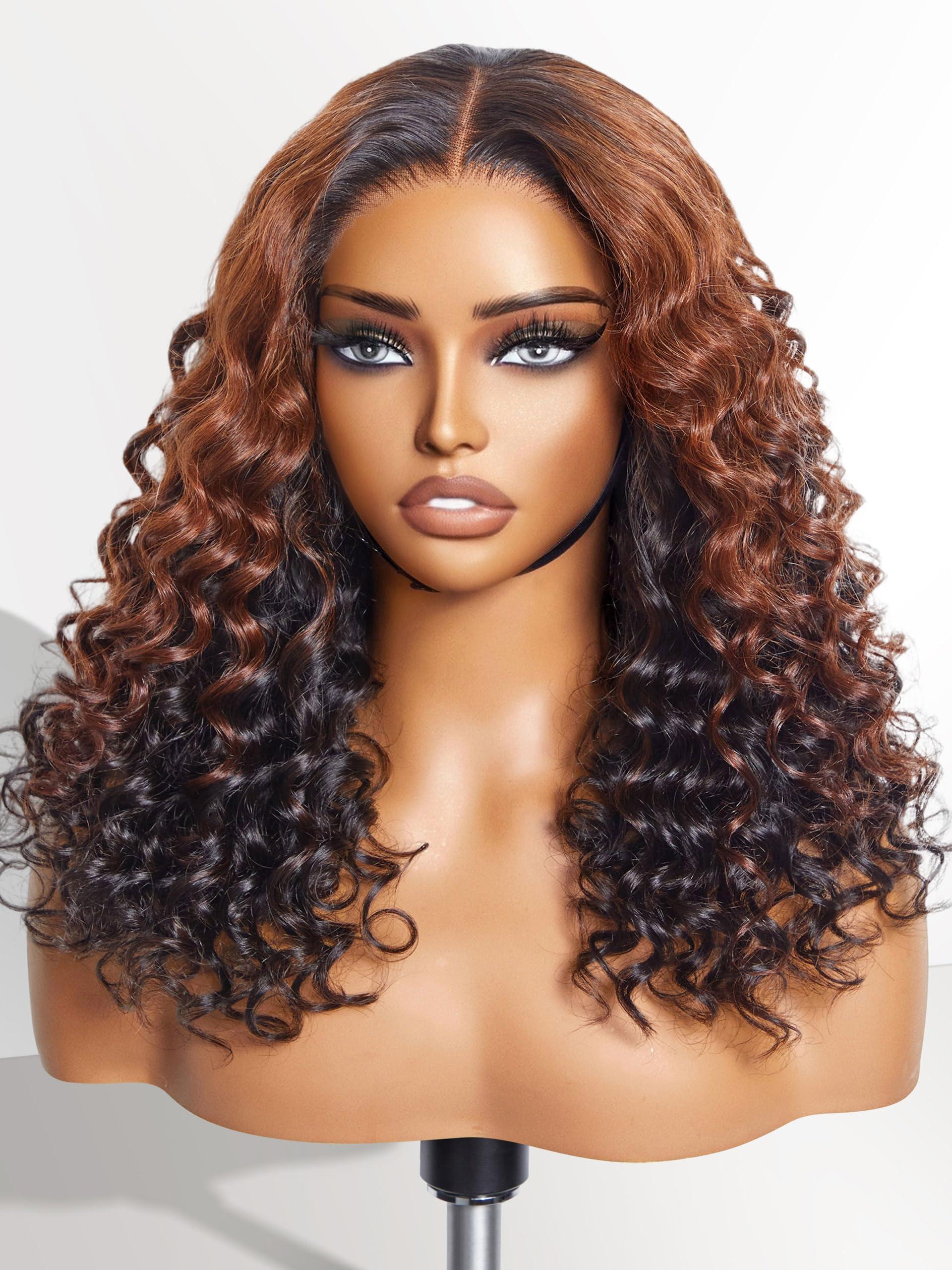 LUVME HAIR 18 Inch Black with Brown Highlights Deep Wave Human Hair Wig, Precut Glueless 5x5 Lace Closure Wigs Pre Plucked For Women 180 Density