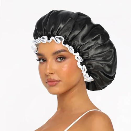 - DOUBLE LAYERS WATERPROOF SHOWER CAP - Luvruitaky reusable waterproof shower cap contains two layers, including a smooth and skin-friendly satin outer layer and a waterproof PEVA inner layer, which effectively prevents your hair from getting wet in the shower or bath, upgrading your shower experience.