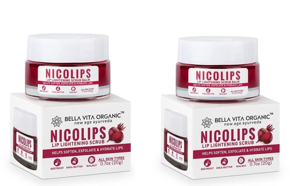 Pack Of 2 Bella Vita Organic NicoLips Lip Balm Scrub For Lightening & Brightening Dark Lips For Men & Women, 20g Natural ingredients moisturize, hydrate and heal lips. Walnut granules remove dead and dry skin, leaving your lips soft and plump, Benefits: Brightens, brightens and softens lips. Gently exfoliates dry, chapped lips. Prevents lip darkening and makes lips supple. Hydrates and heals dry, chapped lips, Beetroot is an antioxidant that has natural whitening properties that lighten dark lips, NicoLips designed to suit all skin types and all genders. It is also a perfect natural lip scrub for smokers to get rid of dark spots caused by smoking, This gentle lip scrub is the best lip scrub for dark lips as it reduces pigmentation and tan from them and gives you bright pink lips
