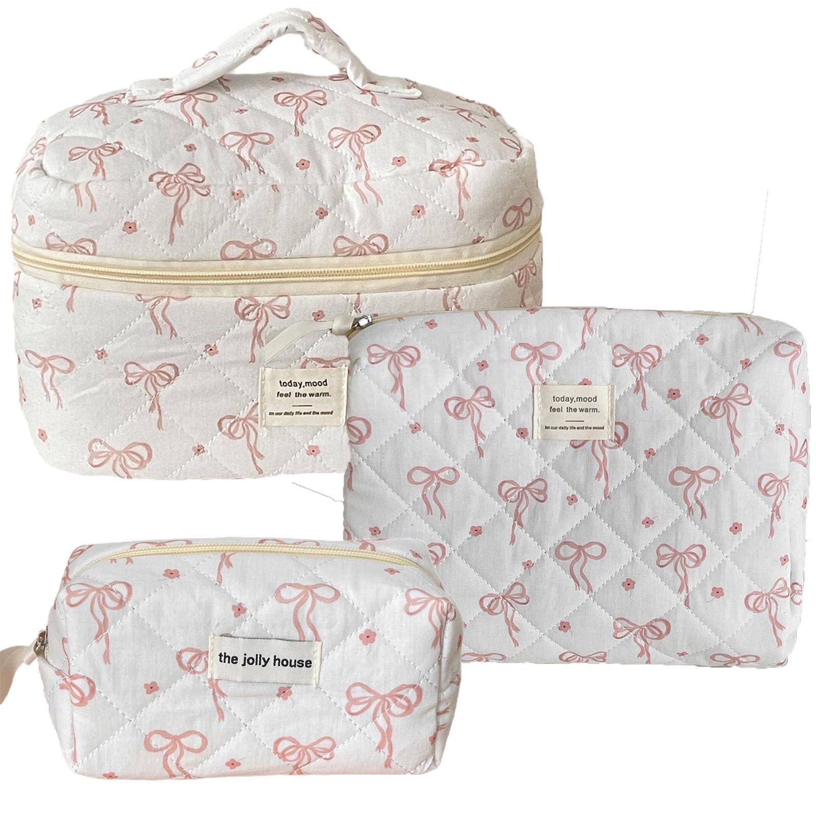 JINFANRUI Makeup Bag Set, 3 Pcs Quilted Makeup Bag Set, Pink Bow Makeup Bag Travel Toiletry Bag, Striped Bear Makeup bags, Cute Cotton Cosmetic Bag Large Travel Makeup Bag For Women And Girls (E)