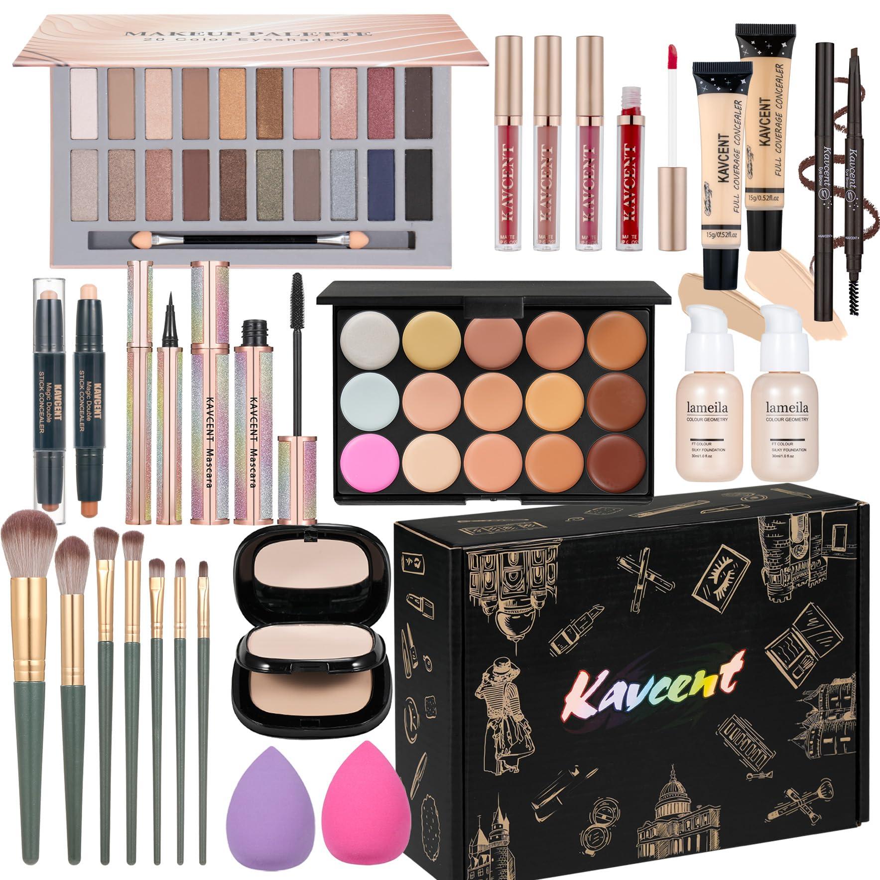 - All In One Makeup Sets The makeup kit Gift Set including 20 color Eyeshadow Palette,Foundation,Concealer,Lipstick,Mascara,Lip Gloss,Eyebrow Pencil,Eyeliner,Contour Stick,Powder Puff,Makeup Brushes,Pressed Powder,Concealer Palette