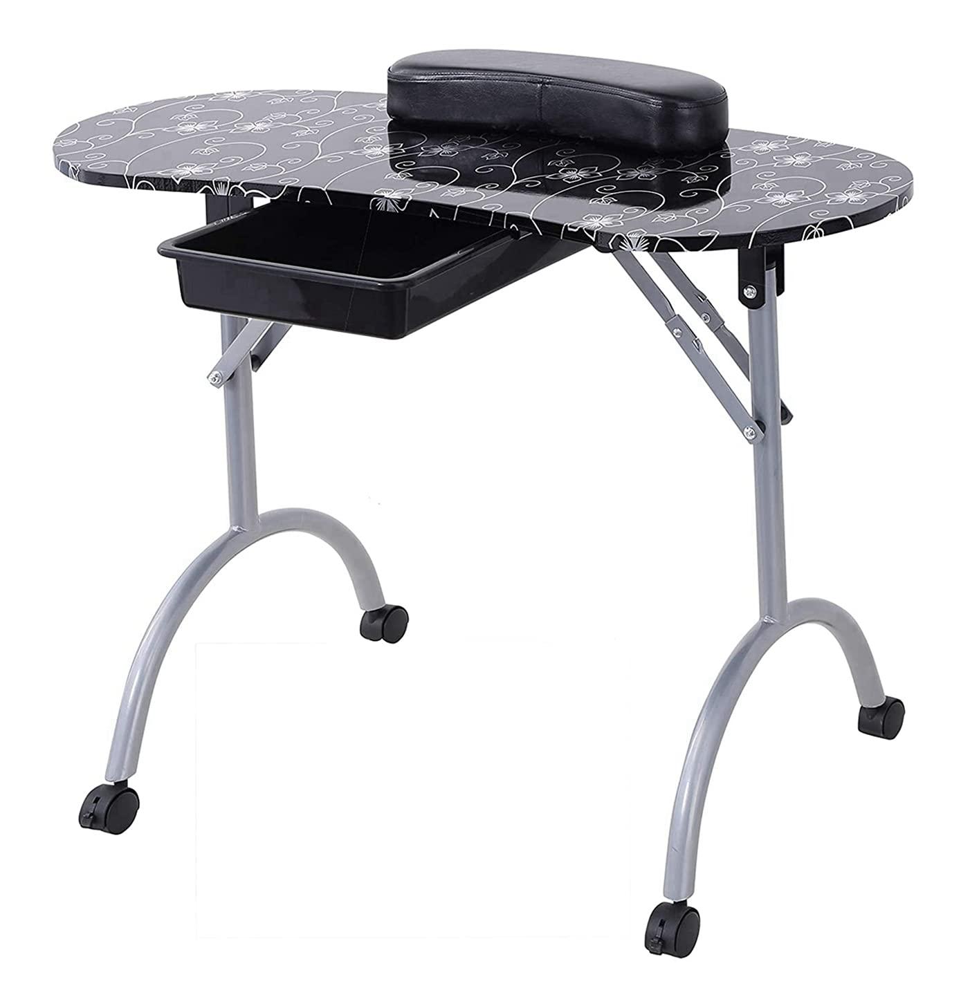 - This manicure table nail desk is designed with removable & super-comfy arm rest cushion and easy-to-carry folding metal legs; Plastic drawer perfect to keep your accessories well organized; A waterproof zippered carry bag for convenient storage & easy transport.