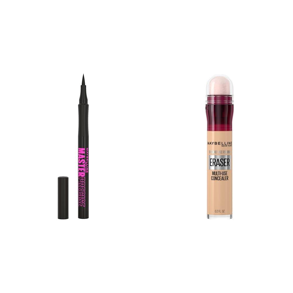 This product bundle includes two Maybelline makeup essentials that work together to create flawless-looking eyes. The first component is the Maybelline Master Precise All Day liquid eyeliner in black. Its ultra-fine tip provides precise control to create any eyeliner look, from thin lines to thick dramatic wings. The no-slip grip and saturated formula allow it to glide on easily in one stroke and last over 12 hours without smudging. The second component is Maybelline's #1 concealer, the Instant Age Rewind eraser for dark circles. Infused with goji berry and Haloxyl, it instantly brightens and smooths the delicate under-eye area while reducing the appearance of dark circles, puffiness, and fine lines for up to 30 hours of wear. Its anti-microbial sponge applicator makes it easy to apply. Together, these long-lasting Maybelline eye makeup products allow you to flawlessly define your eyes with the eyeliner and then erase any imperfections with the concealer to create a radiant, youthful look that lasts all day.