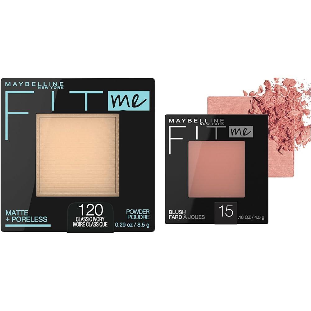 This makeup bundle pairs Maybelline's Fit Me Matte + Poreless Pressed Face Powder with their lightweight Fit Me Blush to help create a flawless, natural look. The pressed face powder leaves skin with a poreless finish and controls shine for up to 12 hours thanks to its perlite mineral technology and blurring micro-powders. Available in a classic ivory shade, it provides a smooth, even application and coverage for a wide range of skin tones. Complementing the powder, the Fit Me blush delivers a creamy, blendable formula that creates a natural flush. Its true-to-tone pigments ensure the blush looks natural on the skin. The collection of shades allows you to find a option that complements your complexion. Together these two products allow you to achieve a perfected, yet natural look. The pore minimizing powder creates an ideal canvas while the blush adds a healthy glow. Both formulated to suit a variety of skin types and concerns.