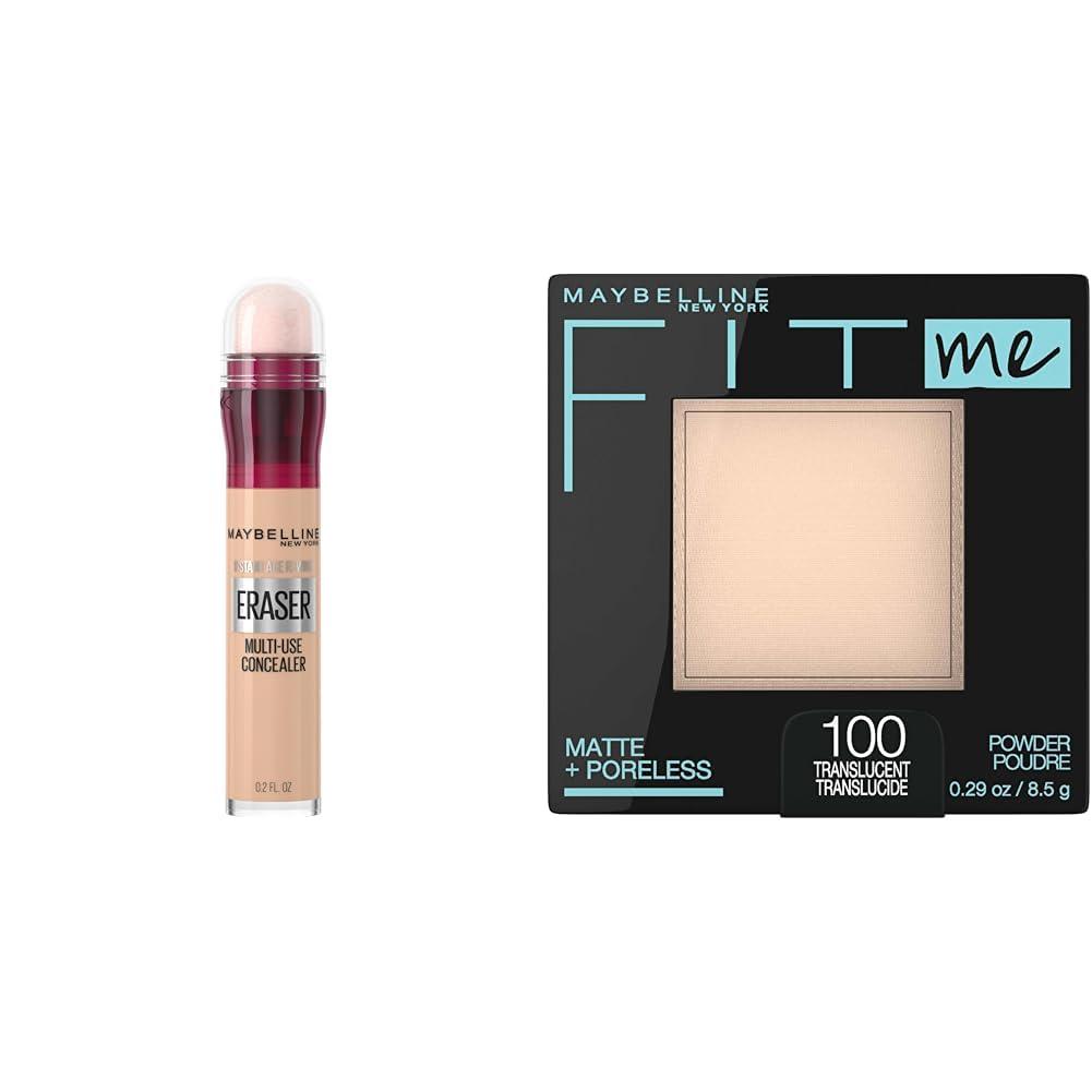 This makeup bundle pairs Maybelline's Instant Age Rewind Dark Circles Treatment Concealer with their Fit Me Matte + Poreless Pressed Face Powder. The concealer comes in a 0.23 fl oz tube to instantly brighten and smooth the delicate under-eye area. Infused with goji berry and Haloxyl, it reduces the appearance of dark circles, fine lines, puffiness and dullness. The oil-free face powder provides shine control and blurs pores for up to 12 hours of natural-looking wear. With its lightweight, buildable coverage, the translucent powder works well for normal to oily skin. Together these two bestselling Maybelline products allow you to achieve a flawless, radiant complexion by color correcting and perfecting targeted areas on the face.