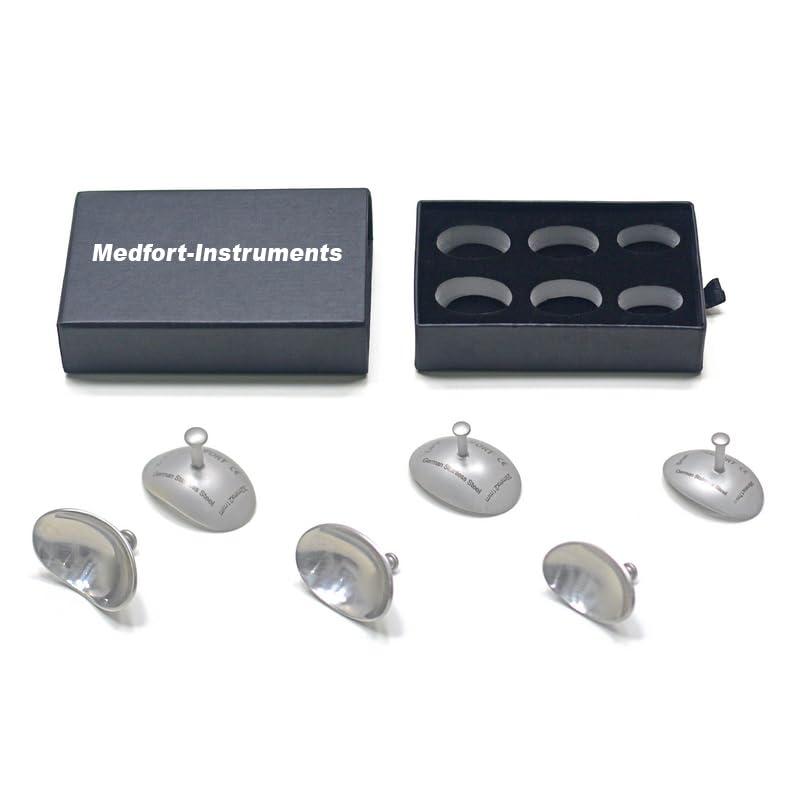 Safeguard your eyes with this set of corneal eye shields from Medfort-Instruments. These stainless steel protectors come in three different sizes - small (26mm X 17mm), large (29mm X 21mm), and extra-large (32mm X 21mm) - to accommodate various eye shapes and sizes. The shields feature a holding point for secure placement and easy removal. Protect your eyes during medical procedures, laboratory work, or any activity where eye safety is paramount. This set includes three pairs, one of each size, conveniently stored in a compact carrying case. With their durable construction and precise fit, these corneal eye shields offer reliable protection for your precious vision.