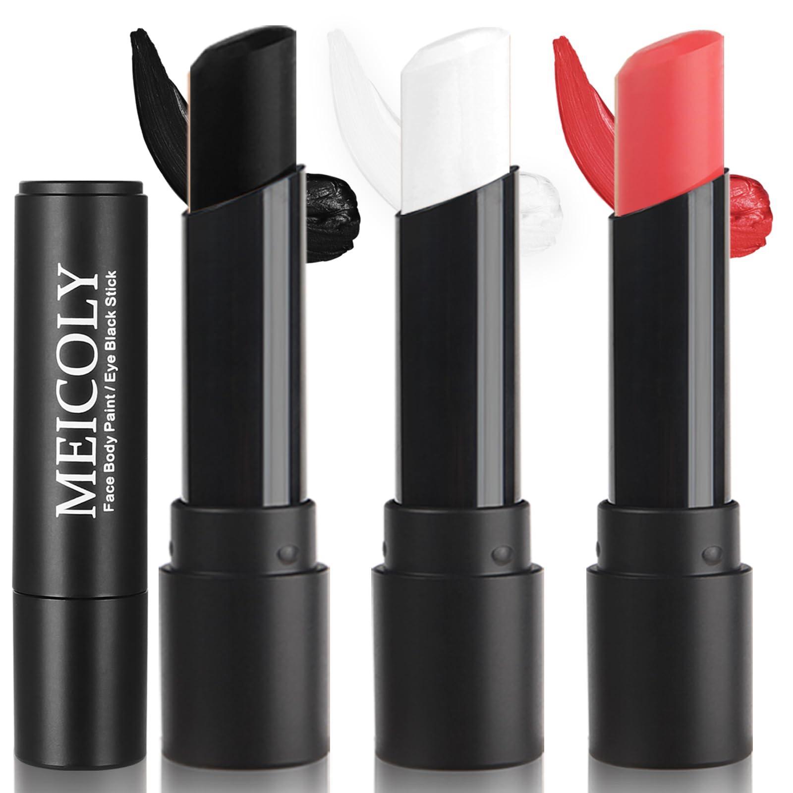 - PROFESSIONAL CLOWN MAKEUP FACE PAINT STICK--- MEICOLY clown face body paint set includes 3 different color paint stick,you will get red face paint stick,white face paint stick,black face paint stick,meet your need for clown makeup and spiderman makeup with full coverage.The cream consistency makes it blend into the skin easily with a brush, sponge or finger.Perfect cream face paint for Halloween clown spiderman vampire skeleton clown joker devil makeup