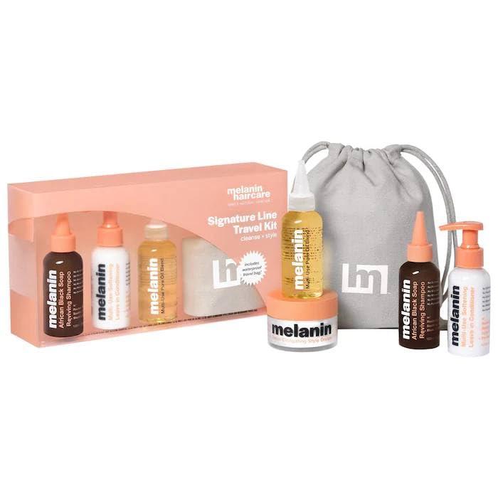 - The Melanin Haircare Limited Edition Signature Line Travel Kit features the Signature Collection packaged in flight-approved 3.4oz containers, housed in an exclusive drawstring canvas bag.