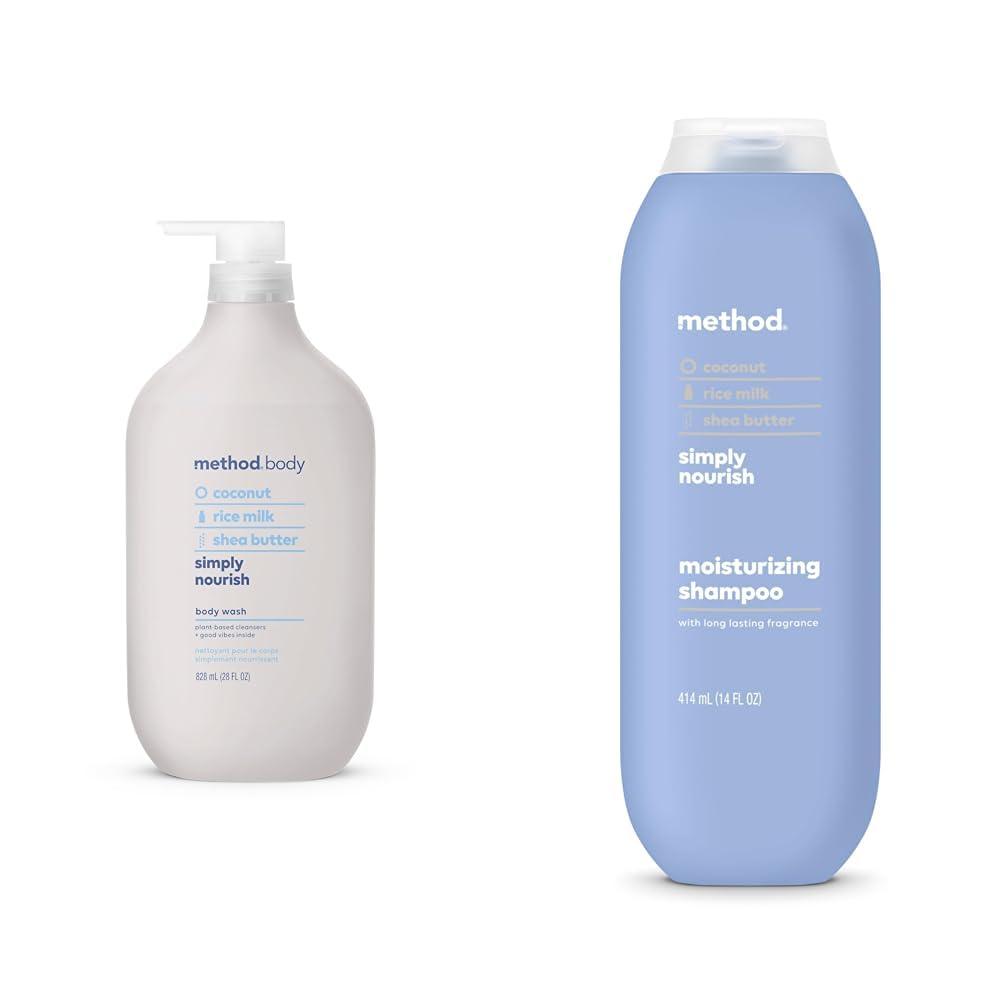 This bundle pairs Method's Body Wash and Shampoo from the Simply Nourish line, allowing you to enjoy matching fragrances during your self-care moments. The 28 oz Body Wash features a biodegradable formula with plant-based cleansers and notes of coconut, rice milk and shea butter. It leaves skin moisturized with a sweet, comforting scent. The bottle contains 80% post-consumer recycled plastic. Complementing the Body Wash is Method's 14 oz Moisturizing Shampoo. Infused with the same Simply Nourish fragrance, this cruelty-free shampoo gives hair irresistible shine and moisture. The formula includes shea butter and is free of parabens, sulfates and dyes. Like the Body Wash, the Shampoo bottle contains 80% recycled plastic. With biodegradable, ethically-sourced formulas and bottles made of recycled materials, Method's Simply Nourish products allow you to treat yourself while still caring for the planet. Enjoy matching scents during your self-care routine with this bundle containing the Body Wash and Moisturizing Shampoo.