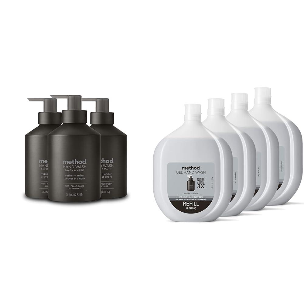 Method Premium Gel Hand Wash Refill, Vetiver + Amber, Recyclable Bottles, Biodegradable Formula, 34 fl oz (Pack of 4)