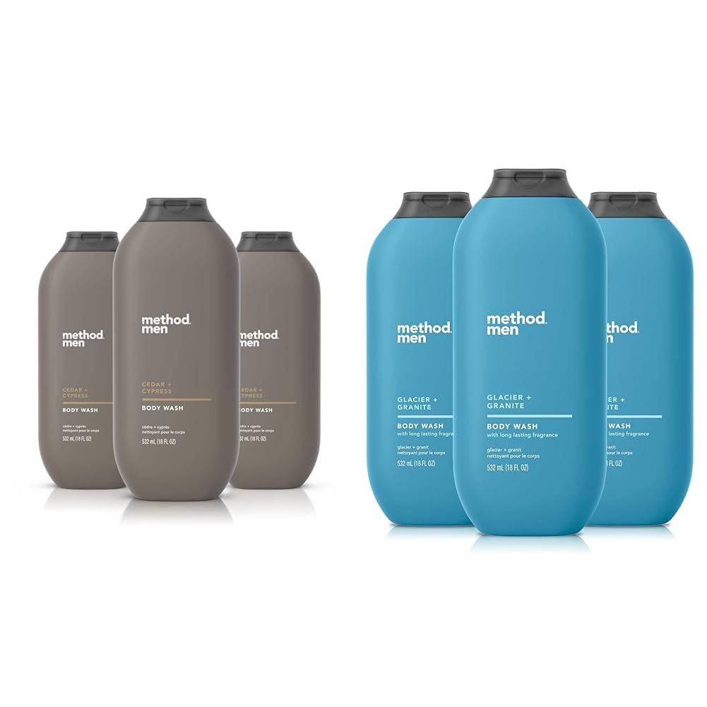 - Contains (3) 18 oz bottles of Method Men body wash in woodsy Cedar + Cypress and crisp Glacier + Granite scents.