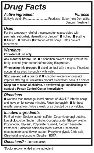 Control Scalp build-up and dandruff with MG217 Dandruff Shampoo and Conditioner, 3% Salicylic Acid Shampoo and Conditioner. Formulated with maximum strength 3% Salicylic Acid, this medicated dandruff shampoo & conditioner is a shampoo and conditioner for dry scalp and provides temporary relief from itching, flaking, and scalp irritation. Psoriasis, dandruff, and seborrheic dermatitis don't stand a chance against this medicated dandruff shampoo for scalp problems. This shampoo and conditioner soothes and moisturizes to repair, protect and control scalp build-up. Salicylic Acid is a doctor recommended active ingredient for the control of dandruff and helps prevent recurrence. Wet hair then massage liberal amount of MG217 into the scalp and leave on for several minutes. Rinse thoroughly. For best results, use at least twice a week or as directed by a physician.