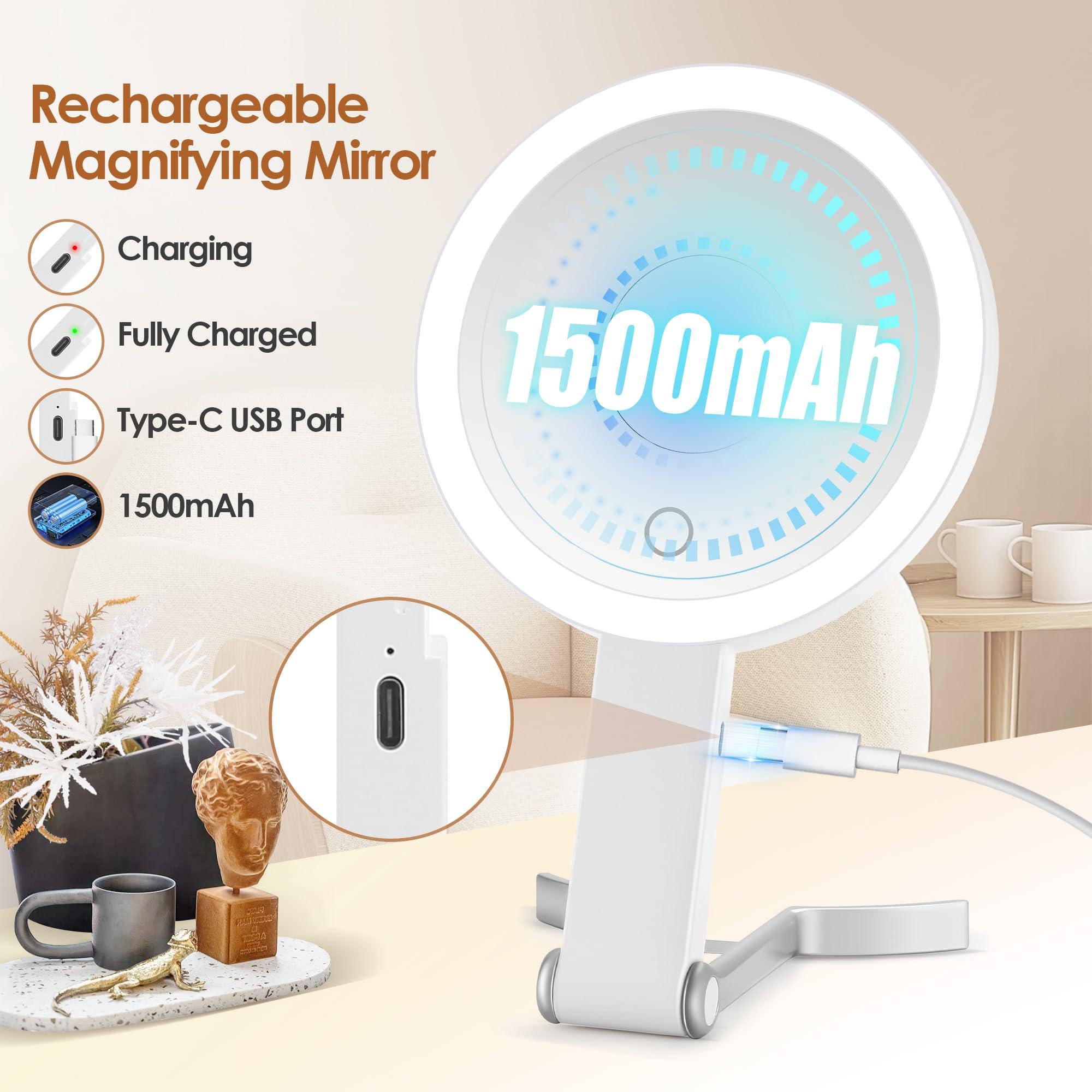 - 1500 mAh Rechargeable Handheld Mirror & Wireless UseThis portable makeup mirror has a built-in 1500mAh battery and can be used wirelessly when fully charged.It takes only 2-3 hours to charge and can work for 2-10 hours.The indicator light flashes red when charging and turns green when fully charged.The folding mirror connects to a laptop, charger or mobile power, Powerbank and PC via the included Type C cable.