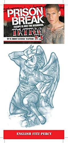 Prison Break English Fitz Percy Tattoo Look just like TV's famous Michael Scofield! Official licensed Prison Break Temporary Tattoos are Hollywood Movie quality and are actual replicas of the tattoos worn by TV's famous Michael Scofield. Each tattoo looks 100% authentic will real ink shading and hardline blue black ink effect that makes these tattoos appear to be real, even under close inspection! Each temporary tattoo will last for weeks with proper care. Includes: One English Fitz Percy tattoo printed on a large 7" x 5" sheet which is represented as the white area behind the tattoo image on the picture of the packaging (for size reference)