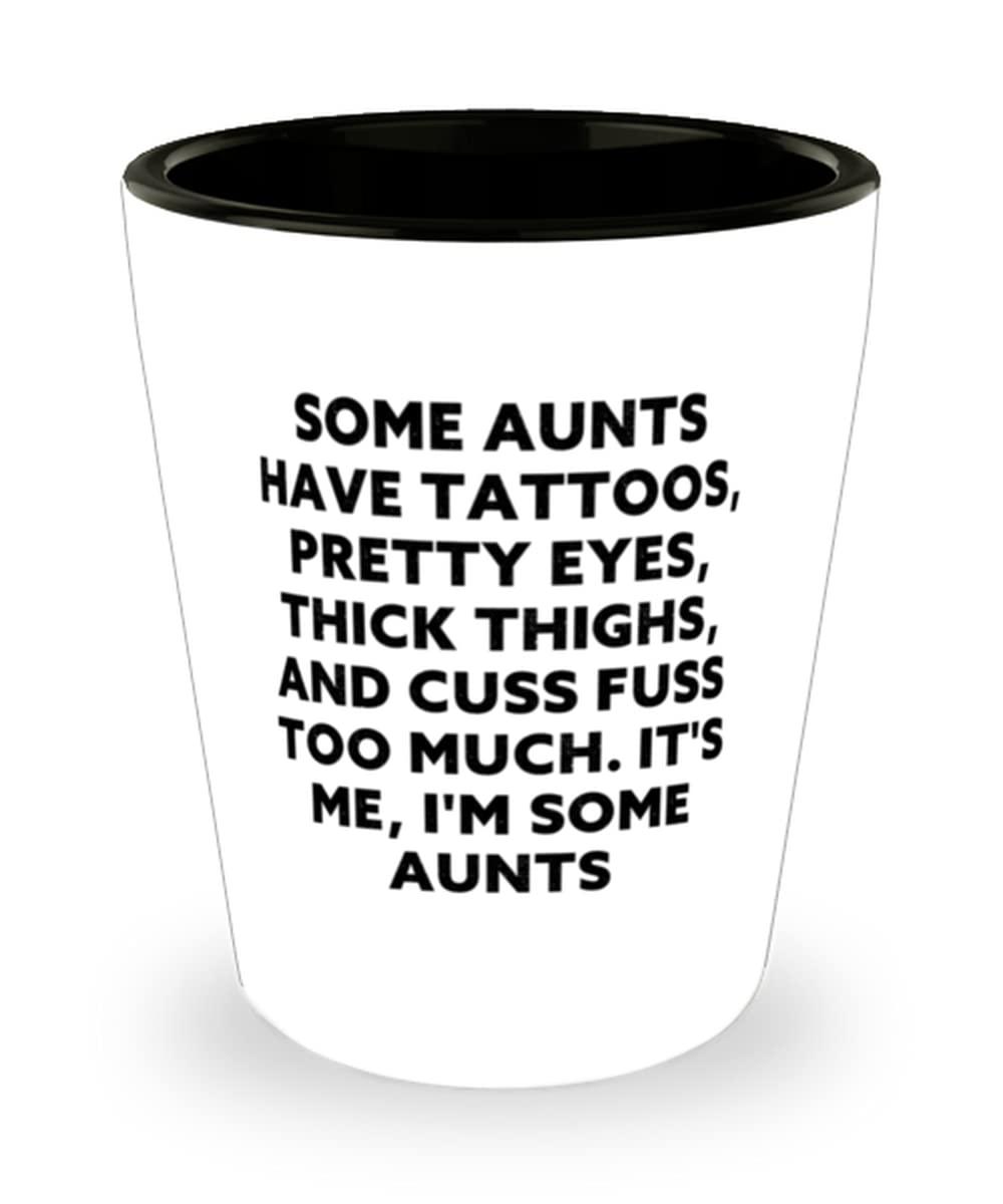 - This unique shot glass features the funny quote, 'Some aunts have tattoos, pretty eyes, thick thighs, and cuss fuss too much.' Perfect for expressing love to your aunt on her birthday or any special occasion.