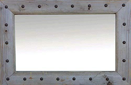 Rustic Mirrors With Country Charm - Bunkhouse Style Barn Wood Mirror with Tacks Rustic Mirrors handcrafted from natural barn wood are our specialty. We especially like this unique mirror which features a wide 3.5 inch barnwood frame face. We've added distressed nail-head tacks all the way around the outside of the wood frame, which makes this a unique-looking mirror that adds character and charm to your western rustic or primitive decor. This mirror can be hung either horizontally or vertically. Our mirrors are sold by their exterior dimensions. This mirror can be manufactured in custom sizes. -Due to the nature of reclaimed wood, each mirror is 100% unique. Each features unique colors, textures, knots, character, and charm. Own your own piece of American history. -Hanging hardware is included -Handmade in the USA -Ships in 2-3 weeks