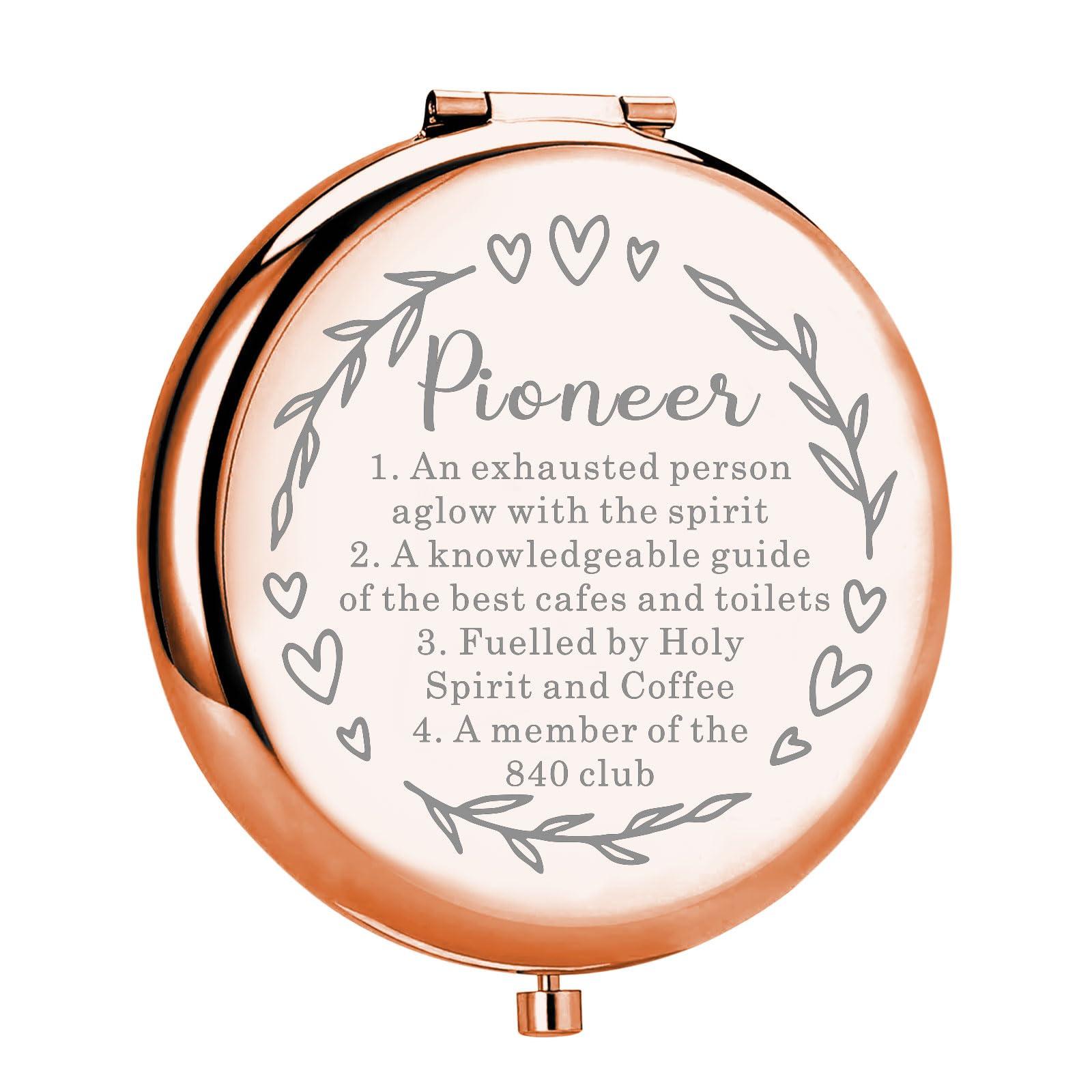 - Compact Makeup Mirror: Engraved with the words "pioneer 1. An exhausted person aglow with the spirit 2. A knowledgeable guide of the best cafes and toilets 3. Fuelled by Holy Spirit and Coffee 4. A member of the 840 club"
