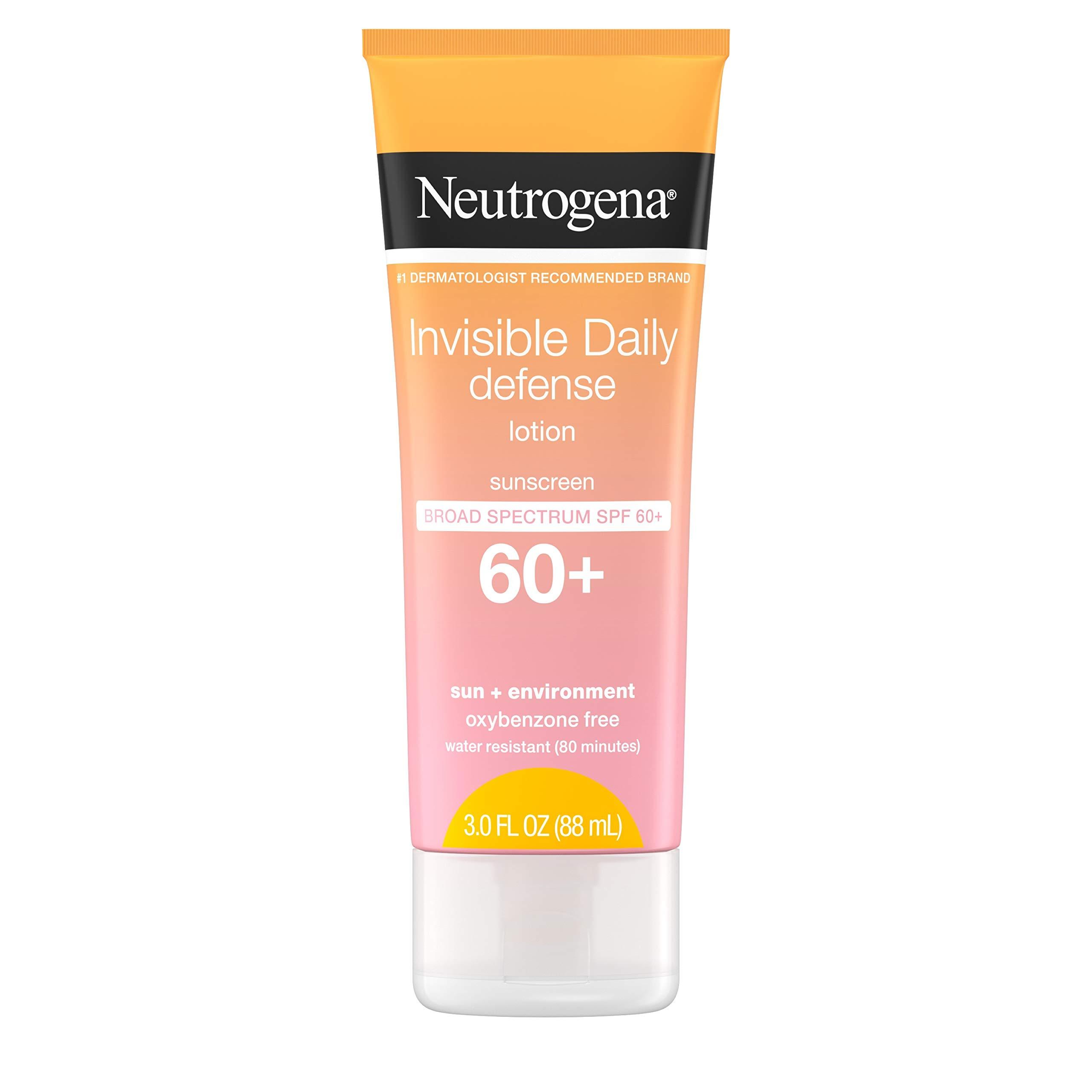 Help protect skin against the sun and environmental aggressors with Neutrogena Invisible Daily Defense Sunscreen Lotion. With SPF 60+ and Helioplex technology, this face and body sunscreen from the #1 dermatologist-recommended sun care brand helps prevent sunburn and provides broad spectrum UVA/UVB protection to help fight against signs of skin aging caused by UVA rays, such as wrinkles, dark spots, fine lines and sagging. The hydrating lotion boosts skin's natural moisture barrier, leaving it looking radiant and renewed. Formulated with antioxidants, the gentle sunscreen lotion also helps fight environmental aggressors such as cold, ozone, and pollution that can damage skin and lead to premature skin aging. The lightweight, quick-drying, non-comedogenic sunscreen rubs in invisibly on all skin tones without white marks and is oxybenzone-, paraben-, and mineral oil-free. Ideal for use during outdoor activities, the lotion is water- and sweat-resistant for up to 80 minutes.