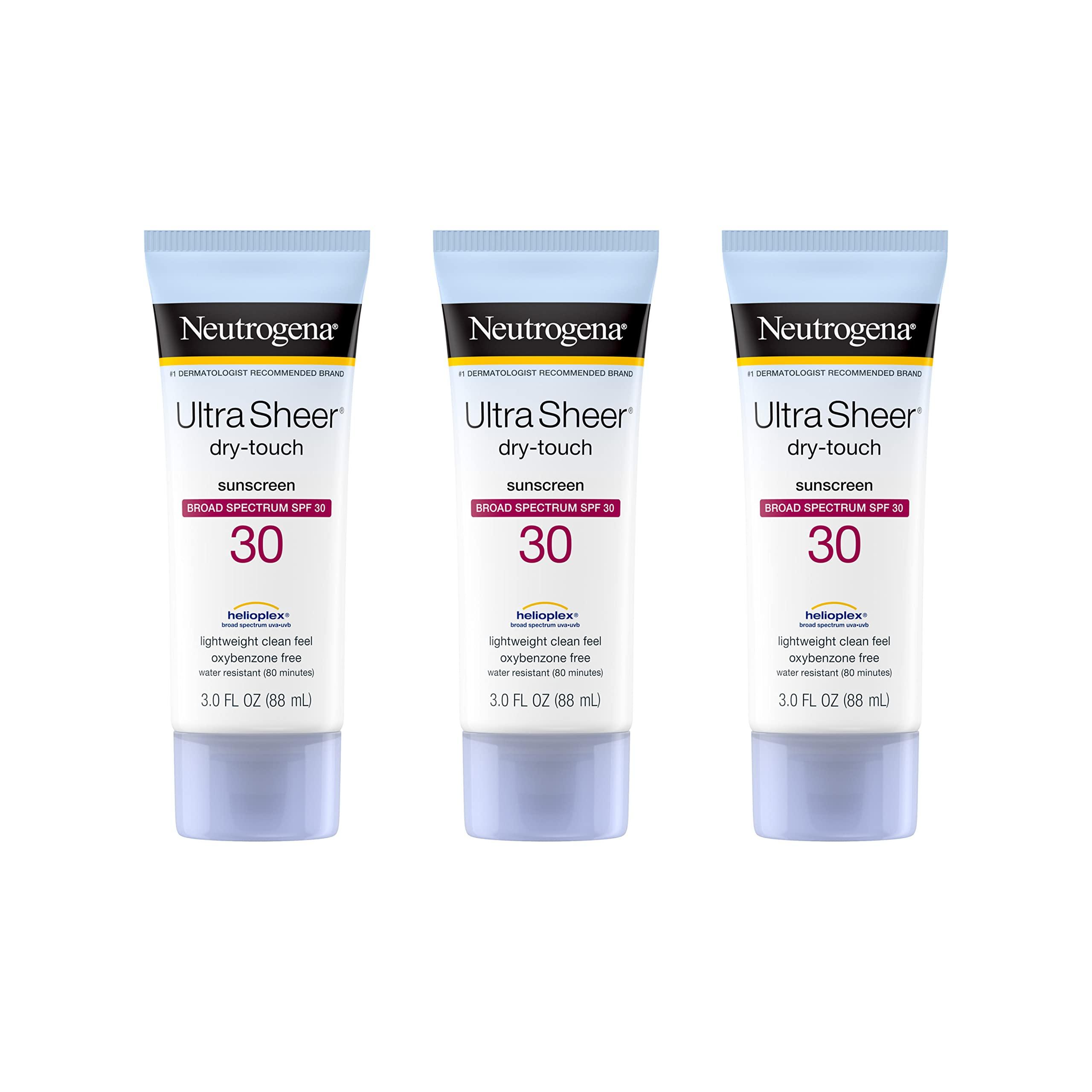 Neutrogena Ultra Sheer Dry-Touch Broad Spectrum SPF 30 Sunscreen. Helioplex broad spectrum UVA-UVB. Lightweight clean feel. Fast absorbing water resistant (80 minutes). #1 dermatologist recommended suncare. 3.0 fl oz (88ml).