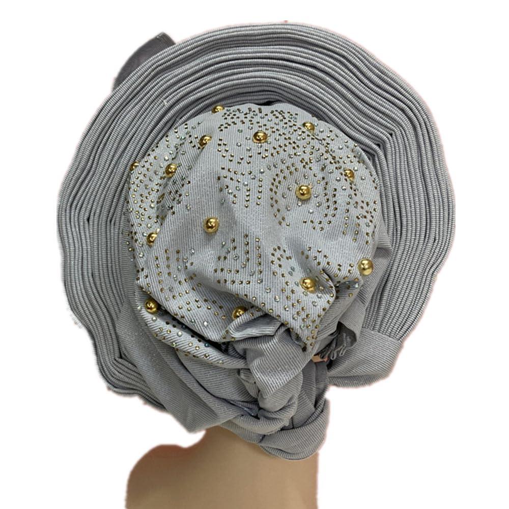 Nigerian ASO Oke Auto Gele Headties with Beads&Stones Already Made African Head Wrap Women Turban Cap Headbands. (Silvery)