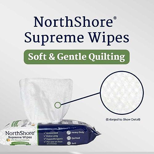 NorthShore Supreme disposable wipes are premoistened with a gentle formulation of hypoallergenic ingredients including aloe and calendula which promote a healthy skin environment. These extra thick wipes have high tensile strength to resist tearing during use. The unique quilted design grips and cleans like a washcloth while feeling smooth and soft against the skin without the need for soap and water. Wipes away dirt and makeup, leaving your skin feeling clean and refreshed. DO NOT FLUSH. (3 Packs of 50 Wipes)