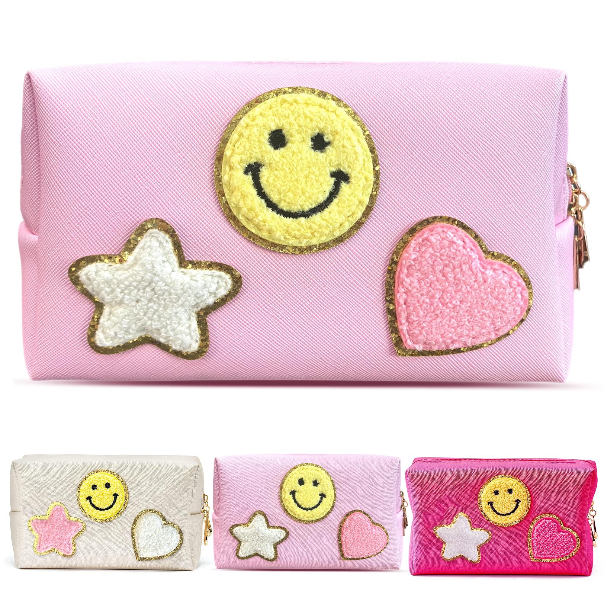 Nylea Preppy Stuff Patch Makeup Bag, PU Leather Smiley Face Makeup Bag Portable Waterproof Small Pouch, Daily Use Travel Cosmetic Pouch for Women Girls Gift (HOT PINK)