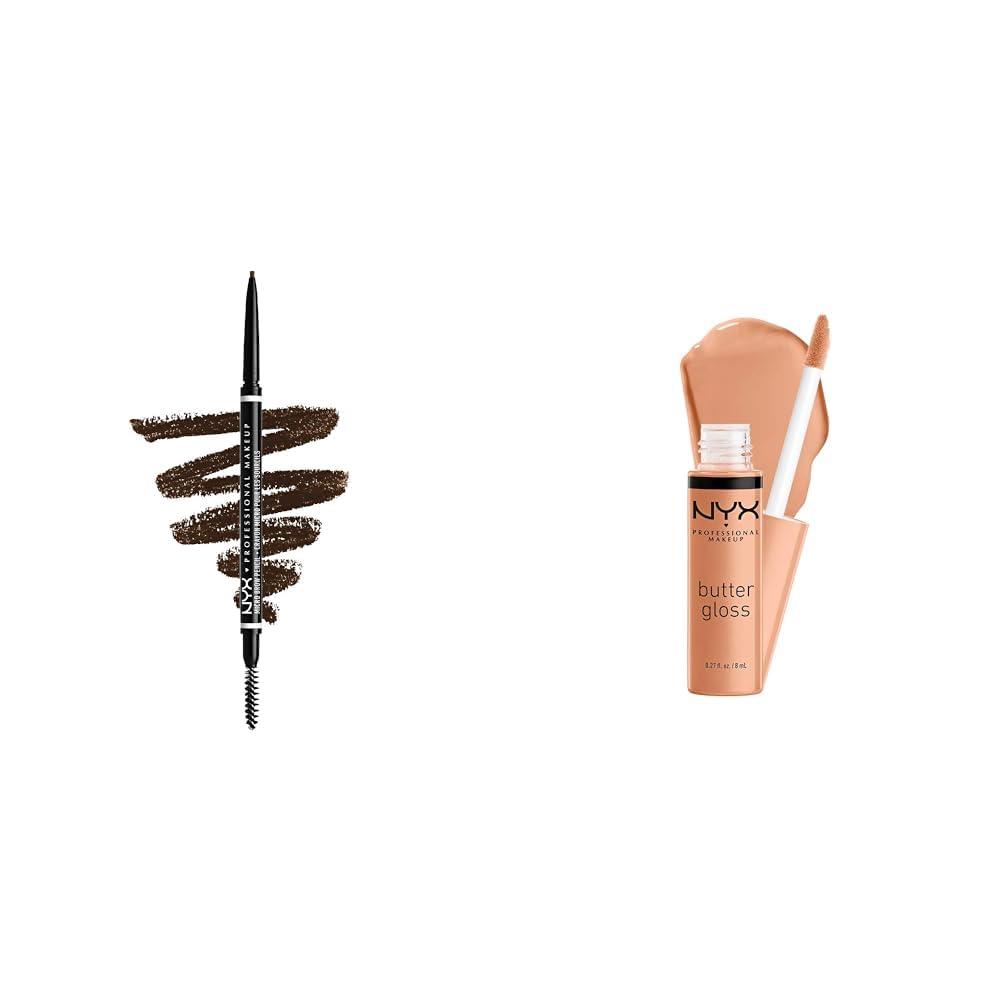 This product bundle pairs an eyebrow pencil with a complementary lip gloss for a complete brow and lip look. The NYX Micro Brow Pencil in Espresso shade helps fill in and define brows with its ultra-fine tip. With 12 shades to choose from, it complements natural brow color for a natural look. Pair it with the NYX Butter Gloss in Fortune Cookie, a true nude shade that provides sheer to medium coverage with a smooth, creamy formula that isn't sticky. With a wide range of shades from nudes to brighter colors, the Butter Gloss offers kissable, supple lips to complement defined brows. Together, these cruelty-free, vegan products create an easy, put-together makeup look whether you're on the go or want an everyday look. The Micro Brow Pencil offers precision and control to shape and fill brows while the Butter Gloss provides a perfect nude lip in a comfortable, non-sticky formula.